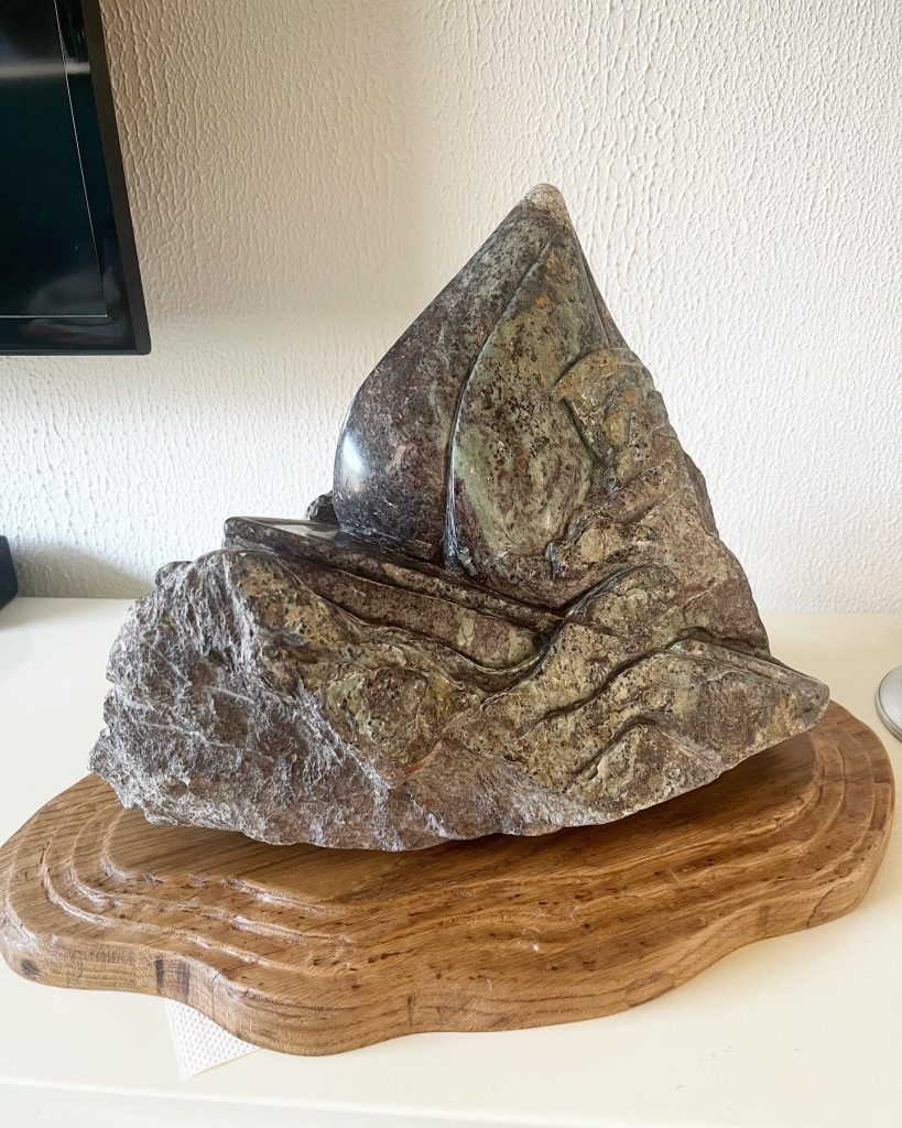 Materiaal en Vorm Natuursteen, groene Serpentijn, gedeeltelijk gepolijst. Eikenhouten sokkel. Gelaagd stenen beeld. Vormen schuiven langs elkaar, als lagen in beweging.